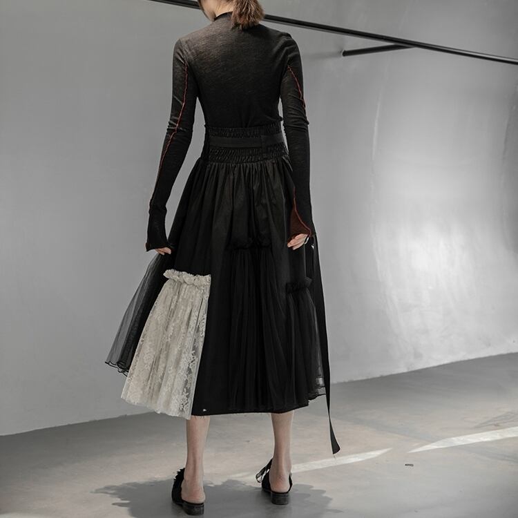 重くなりがちな黒コーデを白のメッシュがアクセントになり