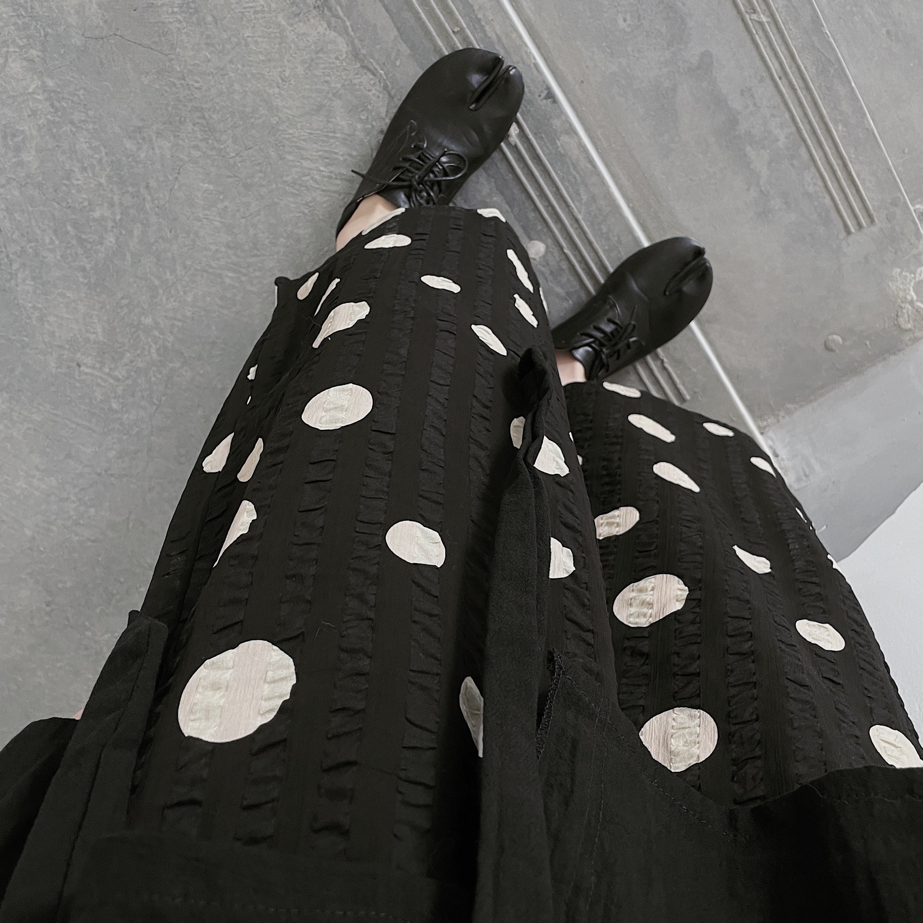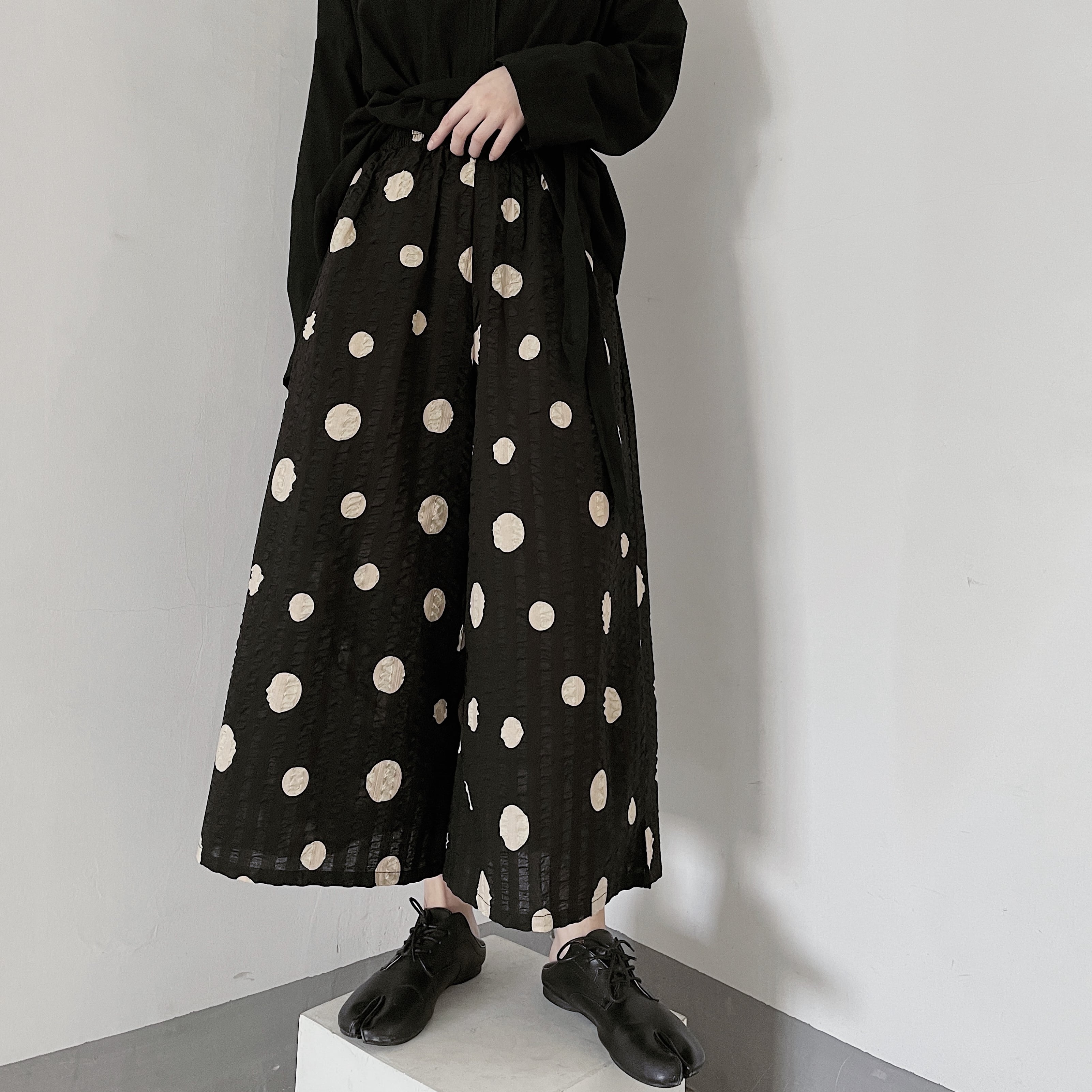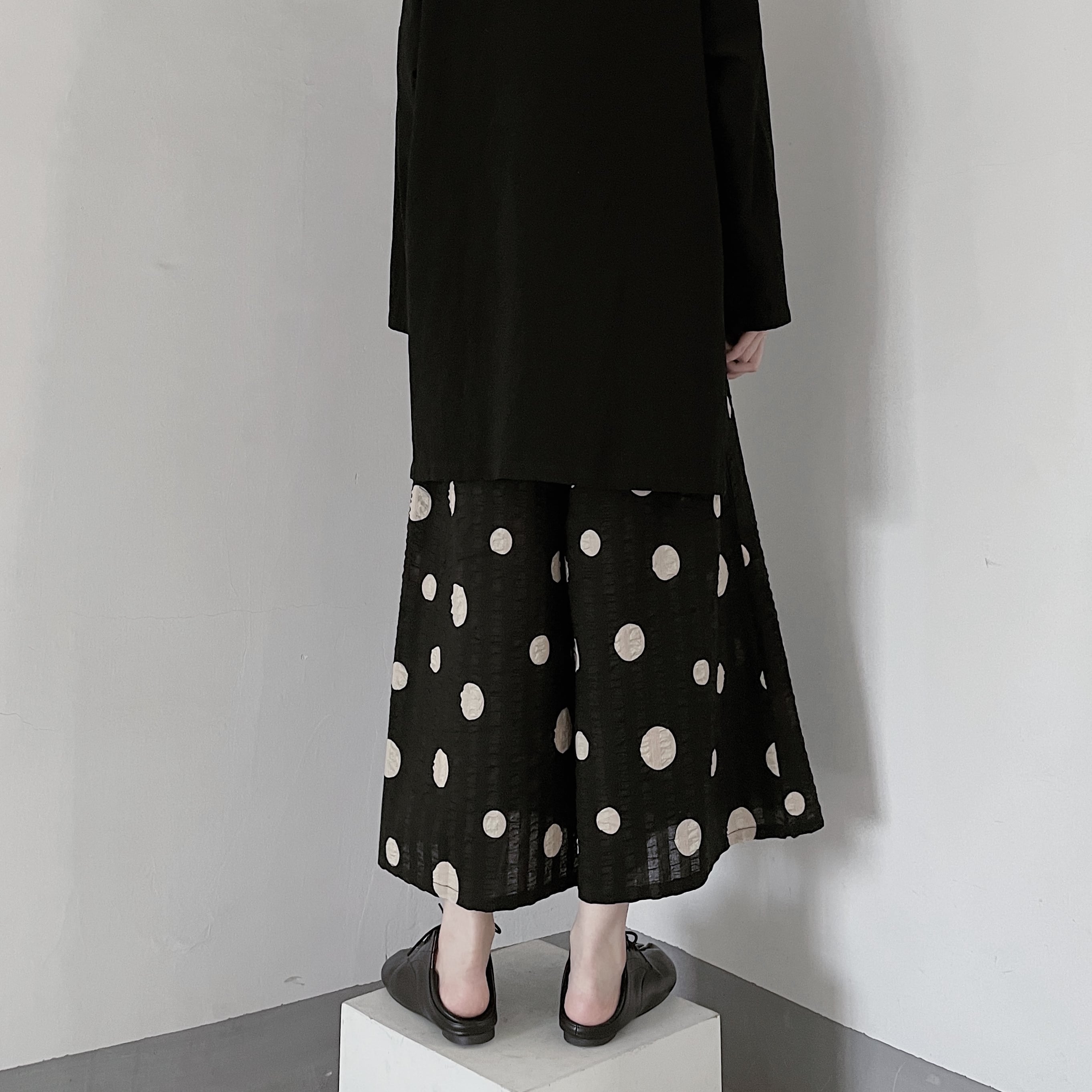 大き目なドット柄が印象的なワイドクロップドパンツ